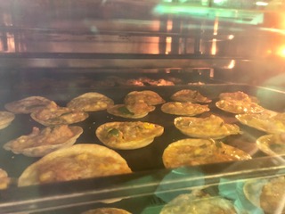 下段の写真は、変わりピザを焼いているとことです。200度の温度で5分間、焼き物機で蒸し焼きにしました。