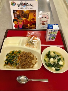 上段の写真は、本日の献立と給食図書でした。本日の給食図書は、「韓国のごはん」でした。韓国の一般的な家庭の食事風景が描かれた図書でした。本日食べたわかめスープも登場していました。