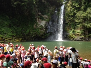 朝食後、歩いて「八反の滝」へ行きました。険しい山道を下るとそこは滝の水しぶきがかかる涼しい別世界が広がっていました。滝つぼの水をさわってみんな「冷たーい」と言っていました。