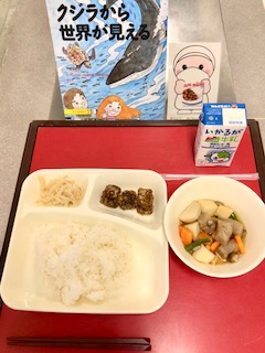 上段の写真は、本日の献立と給食図書でした。本日の給食図書は、「クジラから世界が見える」でした。昨今、クジラの数は増えてきていて、全てのくじらが食べる魚の量は、世界の人々が食べる魚の量よりもはるかに多いことがわかった事等、クジラを中心として食料問題にいつて考える図書でした。