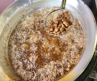 くじらのたつたあげは、しょうが汁、料理酒、しょうゆで下味をつけたくじらにでんぷんをまぶして揚げた、揚げもの料理でした。くじらは年に1度給食に登場します。