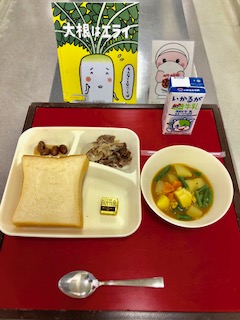 本日の献立は、「牛肉の香味焼き・豚肉とだいこんのカレー煮・うずら豆のグラッセ・食パン(バターキューブ)・牛乳」でした。