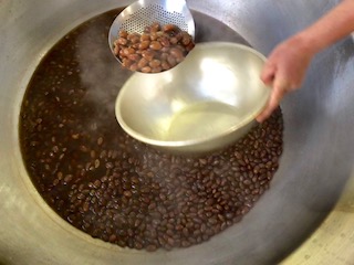 下段の写真は、うずら豆のグラッセを配缶しているところです。