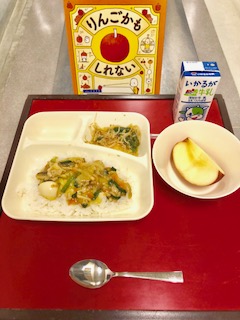 上段の写真は、本日の献立と給食図書でした。本日の給食図書は、「りんごかもしれない」でした。ある日、男の子が家のテーブルに置いているりんごを見て、「…もしかしたら、これはりんごじゃないのかもしれない。」と、普通ではありえないことを思い浮かべる絵本でした。