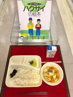 上段の写真は、本日の献立と給食図書でした。本日の給食図書は、「ハクサイの絵本」でした。ハクサイの生態や育て方等が載った絵本でした。