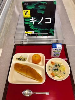 上段の写真は、本日の献立と給食図書でした。本日の給食図書は、「光るいきもの キノコ」でした。緑色に発光するキノコの写真がたくさん載っている図書でした。