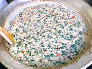 下段の写真は、クリームシチューにほうれん草を加えて煮込んでいるところです。