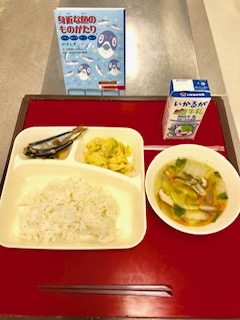 上段の写真は、本日の献立と給食図書でした。本日の給食図書は、「身近な魚のものがたり」でした。イワシ、サンマ、アジ、サバの生態が詳しく載っている図書でした。