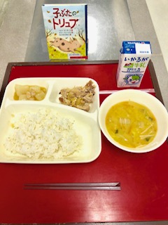 明日の献立は、「あげシューマイ・えびととうふのスープ・もやしとコーンのピリ辛あえ・牛乳」です。明日の献立も楽しみにしていてくださいね。