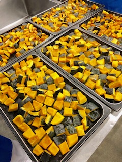 焼きかぼちゃは、オリーブオイルと塩で下味をつけたかぼちゃを、焼き物機で焼いた、冬至にちなんだかぼちゃ料理でした。冬至には、昔からかぼちゃを食べる風習があります。なお、今年の冬至は12月22日です。