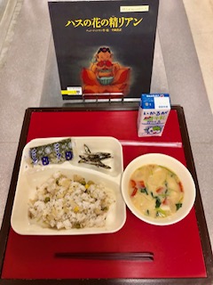 上段の写真は、本日の献立と給食図書です。本日の給食図書は、「ハスの花の精リアン」でした。湖の舟の上で一人暮らす貧しい漁師のローおじさんと、ハスの花の精のリアンという女の子の、優しい絆を描く美しい絵本でした。