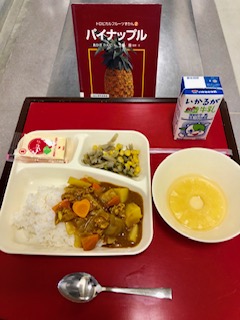 上段の写真は、本日の献立と給食図書です。本日の給食図書は、「パイナップル」でした。沖縄県で育ったパインアップルを缶詰に加工するまでの様子が載っている図書でした。(パインアップルとパイナップルは読み方が違うだけで同じ果物です。)