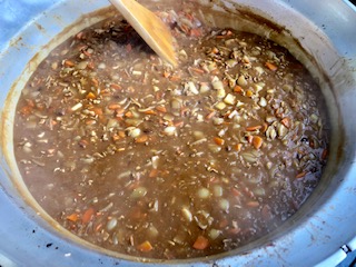 豚肉と金時豆のカレーライスは、豚肉、金時豆、にんじん、じゃがいも等が入った、児童に人気の献立でした。また、ルウの中には「ハート型」のラッキーにんじんも入っていました。