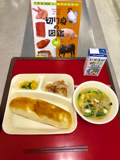 上段の写真は、本日の献立と給食図書です。本日の給食図書は、「切り身の図鑑」でした。にわとりや豚、牛、羊等のたくさんの食肉が載っている図鑑でした。