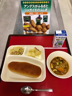 上段の写真は、本日の献立と給食図書です。本日の給食図書は、「アンデスがふるさと ジャガイモのふしぎ」でした。南アメリカのアンデス地方が原産であるジャガイモの、生態や育て方が載っている図書でした。