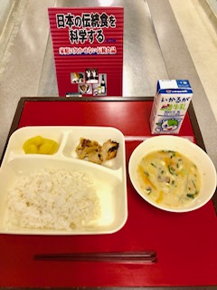 本日の献立は、「鶏肉の甘辛焼き・かす汁・くりきんとん・ごはん・牛乳」でした。