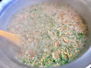 中段の写真は、かす汁に青ねぎを加えて煮て、仕上げているところです。