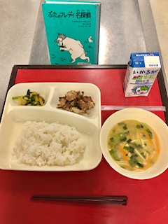 上段の写真は、本日の献立と給食図書です。本日の給食図書は、「ぶたのフレディ名探偵」でした。
