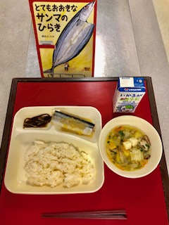 上段の写真は、本日の献立と給食図書です。本日の給食図書は、「とてもおおきなサンマのひらき」でした。市場で買ってきた大きなサンマやスルメやたい焼きが、食べようとすると逃げていくユーモアのある絵本でした。