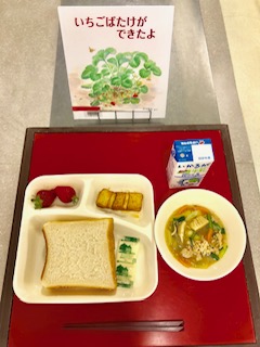 上段の写真は、本日の献立と給食図書です。本日の給食図書は、「いちごばたけができたよ」でした。男の子がおばあちゃんにもらったひとつのいちごの鉢植えから、年を重ねるこどにたくさんのいちごがなっていく、いちごの成長がわかる絵本でした。