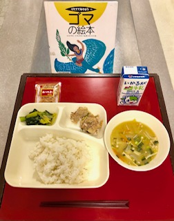 上段の写真は、本日の献立と給食図書です。本日の給食図書は、「ゴマの絵本」でした。ゴマの発祥地や、ゴマの利用のされ方等が載っている絵本でした。