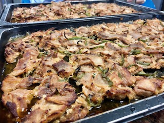 下段の写真は、焼きあがった豚肉のごまだれ焼きです。