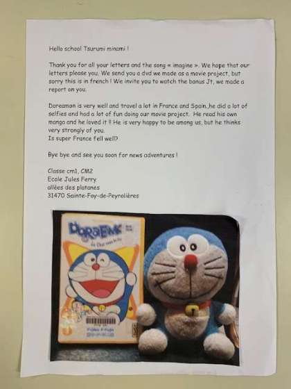 以前から本校と交流している、フランスのジュールズ・フェリー小学校から手紙が届きました。本校の国際クラブの子どもたちの送った手紙への返事や、本校から贈ったドラえもんの人形がフランス各地へ旅行した写真や、授業風景を写したビデオが入っていました。ビデオには、フランスの子どもたちが、本校について調べ学習をしている場面もあって、交流の成果が表れています。