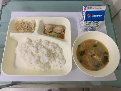 ※鶏肉のバジル焼き  ※ベーコンと野菜のスープ煮  ※キャベツときゅうりのサラダ  ※コッペパン  ※ブルーベリージャム  ※牛乳