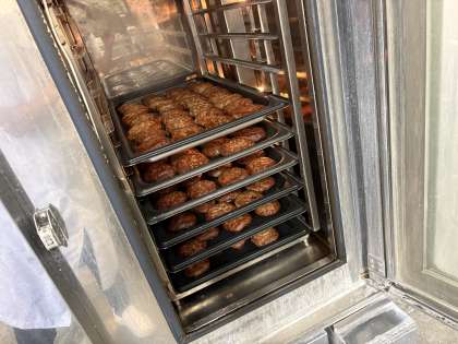 ※写真は、大きなオーブンでハンバーグが焼きあがったところです。一回で、約300個焼くことができます!すごいですね!!