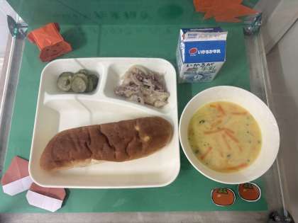 ※豚肉のガーリック焼き ※コーンスープ ※きゅうりのバジルサラダ ※おさつパン ※牛乳