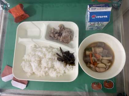 ※豚肉の梅風味焼き ※ふきよせ煮 ※くきわかめのつくだ煮 ※ごはん ※牛乳