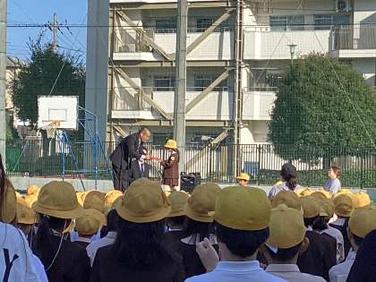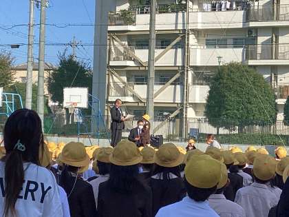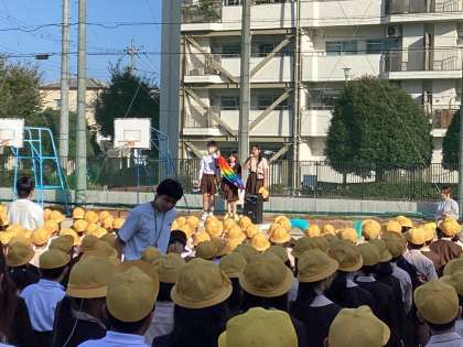 月曜日の朝は全校朝会があります。秋晴れの空のもと、全校児童が運動場に集合しました。