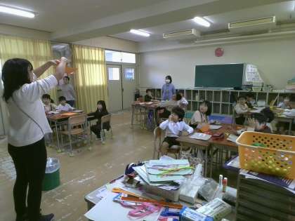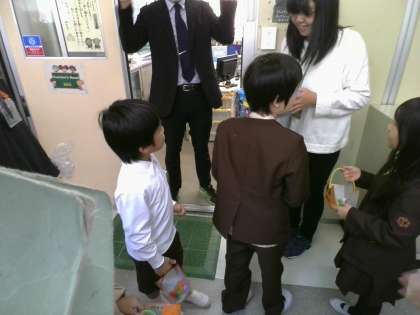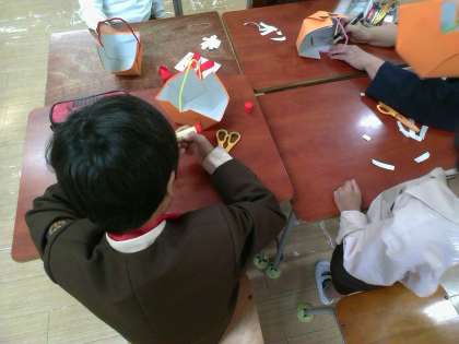今日の「みんなあつまれ」では、ハロウィンが近いのでかぼちゃのかご作りをしました。厚紙を画用紙に貼り、ハサミで切っていきました。かごが完成したあと、ともだち学級の先生や職員室にいる教頭先生に「トリック・オア・トリート」と言ってお菓子をもらっていきました。