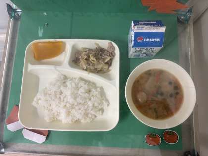 今日の給食は、いわしだんごとだいこん、ごぼう、にんじん、青ねぎなどが入った汁ものです。いわしだんごには、骨や歯をじょうぶにするカルシウムが含まれています。