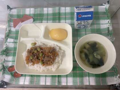 ※ピリ辛丼 ※中華スープ ※白桃(缶) ※牛乳