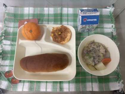 ※豚肉と野菜のスープ煮 ※変わりピザ ※みかん ※黒糖パン ※牛乳