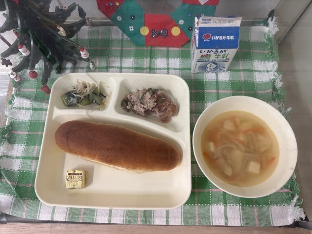 ※豚肉のオイスターソース焼き ※中華スープ ※チンゲンサイともやしの中華あえ ※コッペパン ※バター ※牛乳