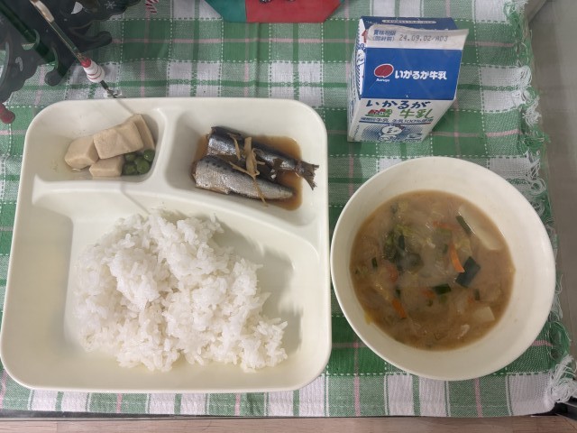 ※いわしのしょうが煮 ※みそ汁 ※高野どうふの煮もの ※ごはん ※牛乳