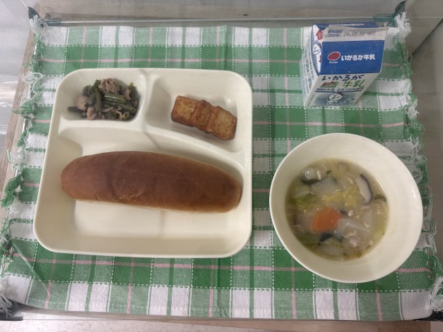 ※はくさいのとろみ煮  ※あつあげのピリ辛じょうゆかけ  ※豚肉とさんどまめのオイスターソースいため  ※黒糖パン  ※牛乳