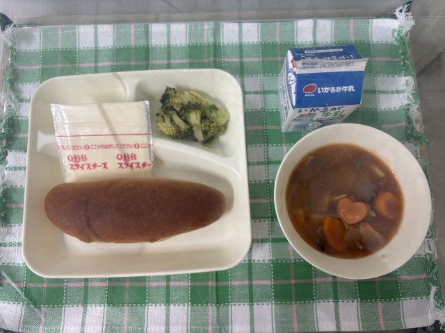※ビーフシチュー ※ブロッコリーのサラダ ※スライスチーズ ※黒糖パン ※牛乳