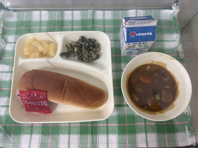 ※ミートボールと野菜のカレー煮 ※ツナとほうれん草のソテー ※パインアップル(缶づめ) ※コッペパン ※いちごジャム ※牛乳