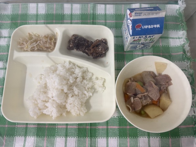 ※くじらのたつたあげ ※豚肉とじゃがいもの煮もの ※もやしの甘酢あえ ※ごはん ※牛乳