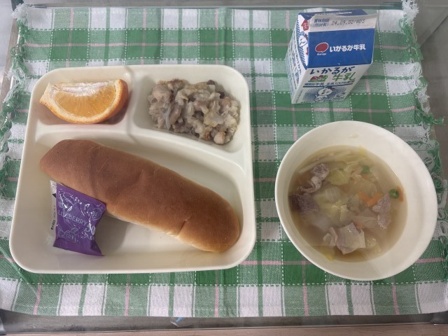 ※押麦のグラタン ※スープ ※いよかん ※コッペパン ※ブルーベリージャム ※牛乳