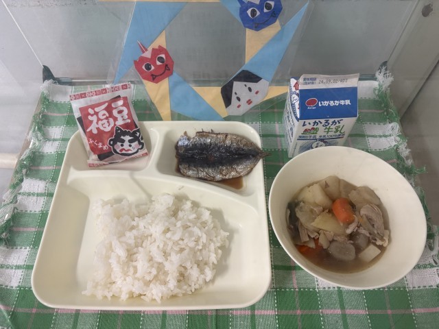 給食では、節分の行事献立として「いわしのしょうがじょうゆかけ」と「いり大豆」が出ます。
