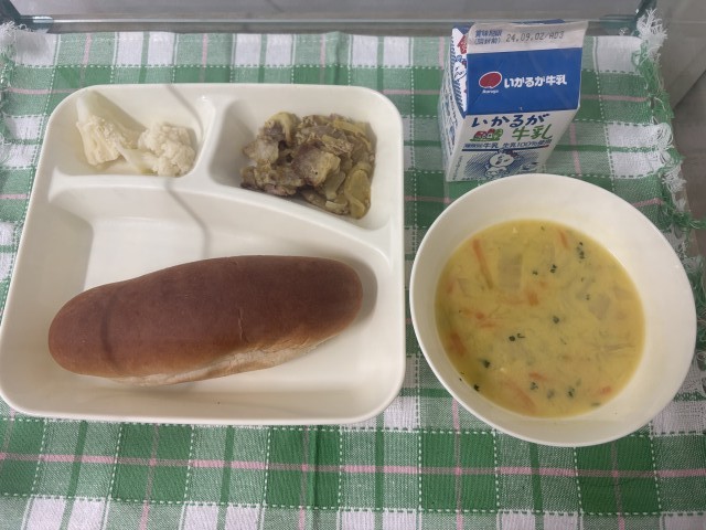 ※豚肉のカレー風味焼き  ※コーンスープ  ※カリフラワーのピクルス  ※黒糖パン  ※牛乳