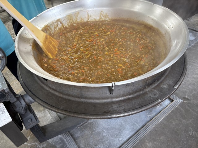 今日の給食では、チキンレバーカレーライスに鶏レバーのペーストを使っています。