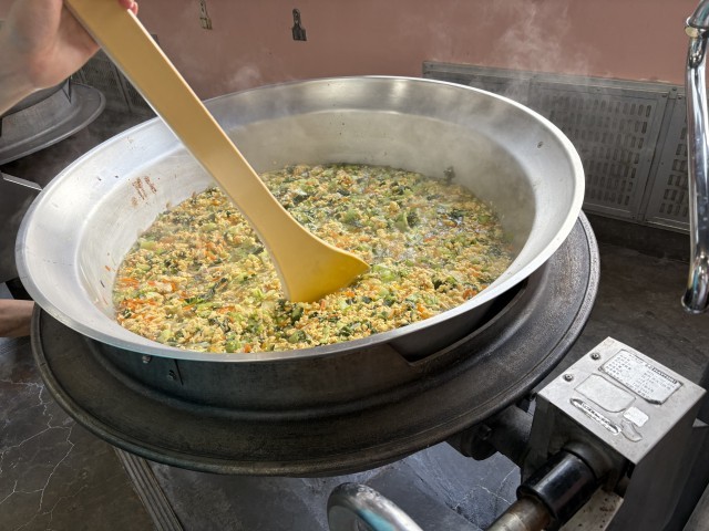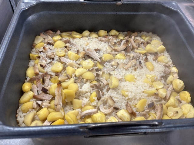 今回の給食は、焼き豚・栗・しいたけが入った「中華おこわ」です。