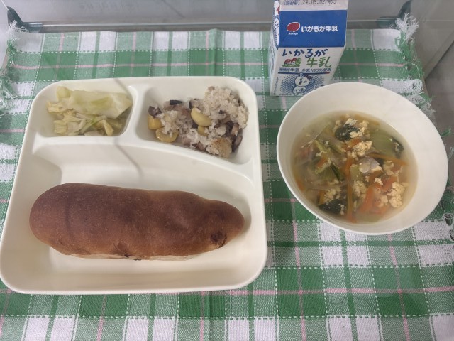 ※中華おこわ ※卵スープ ※キャベツのオイスターソースいため ※レーズンパン ※牛乳