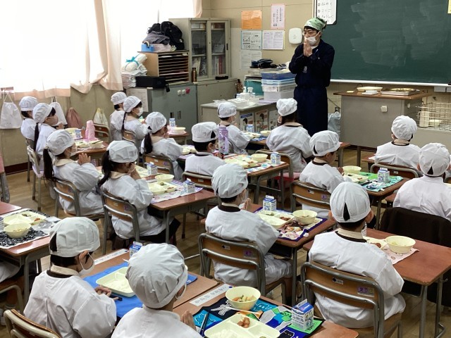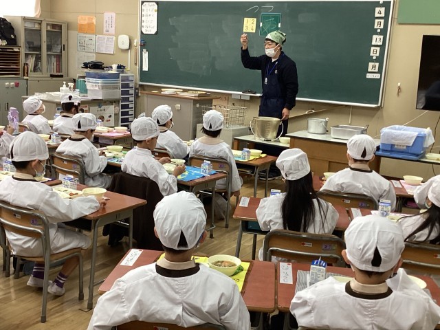 一年生の給食では、担当の先生が箸の使い方について、お話しされていました。