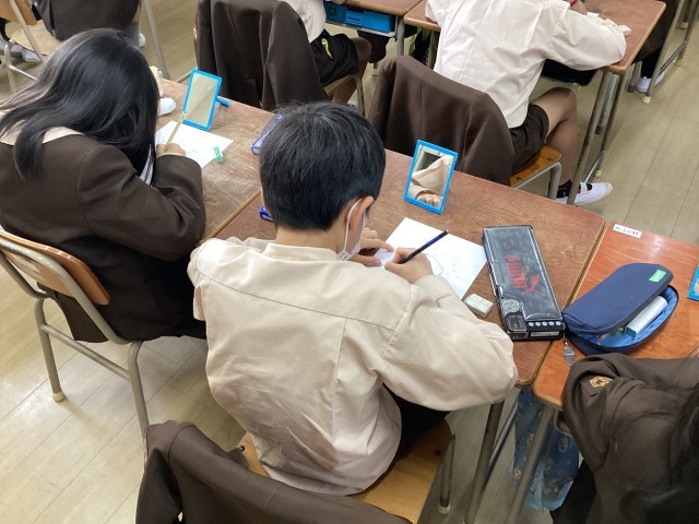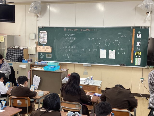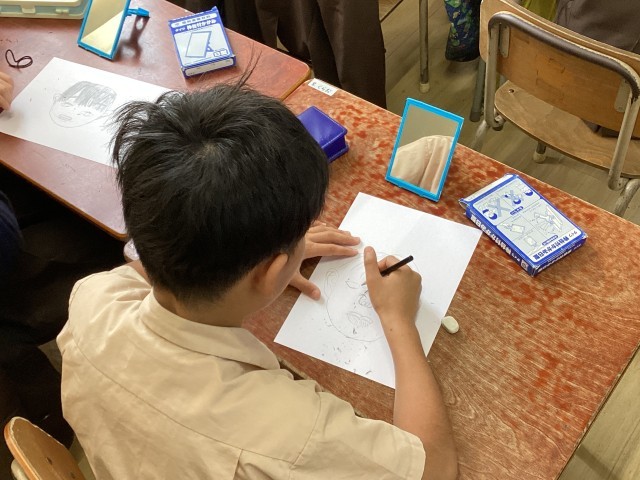 4年生は、図工の時間に鏡をみながら自画像を描いていました。鏡をみながら、自分の輪郭をおいかけます。上手に描けたかな。
